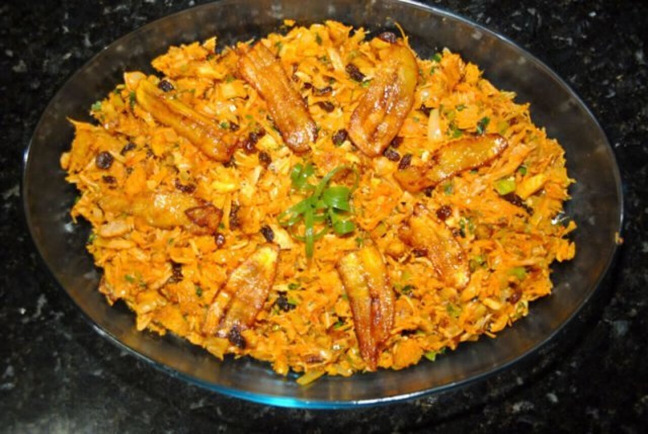 - Montar as camadas: Em uma travessa, disponha a farinha de mandioca, seguida do pirarucu refogado. Acrescente bananas fritas, ovos, azeitonas e cheiro-verde, alternando camadas em boa apresentação.