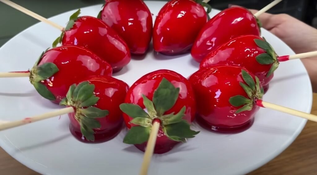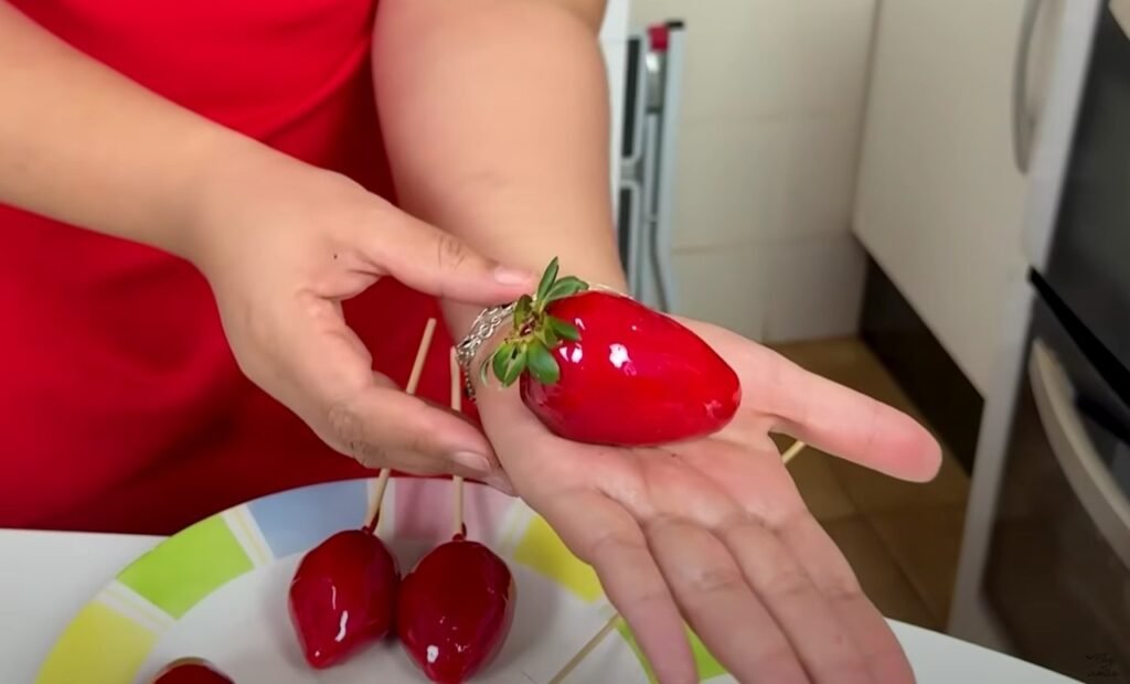 Dica importante: O morango precisa estar bem seco para garantir que a cobertura fixe corretamente e evitar a formação de bolhas na calda. Para aquele brilho característico, utilizar corante alimentício vermelho pode realçar ainda mais a aparência do doce.