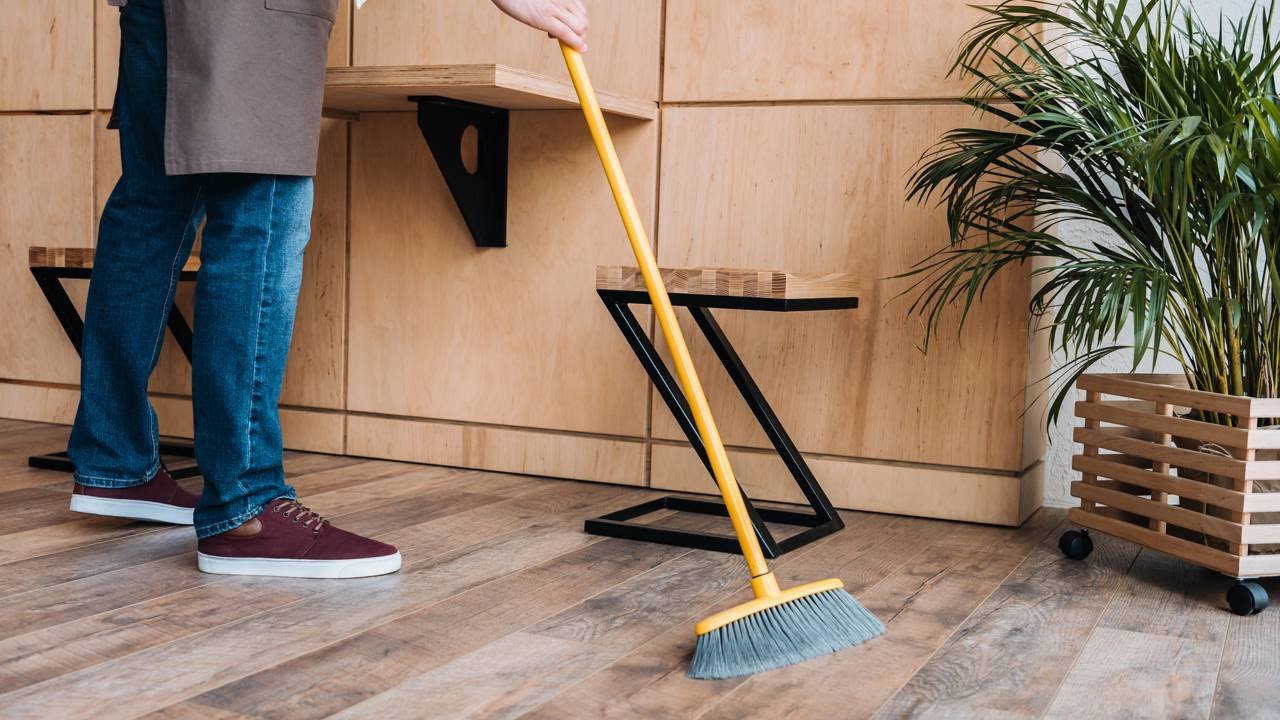 - Borrifar levemente as cerdas da vassoura antes de começar a varrer, evitando encharcar para não espalhar lama ou marcas.