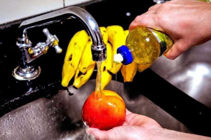 Ela lava tudo que guarda na geladeira. "Quando eu chego da feira ou sacolão, o que é de geladeira eu lavo com águia e sabão. Por exemplo, batata, cenoura, coloco nas sacolinhas e armazeno. Antes de consumir, eu lavo as frutas e verduras, mas chegar e lavar pra deixar na fruteira não, só na hora do consumo. Também lavo as latas [de conservas]."