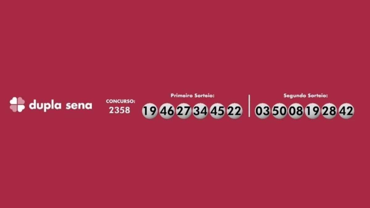 A Dupla Sena teve os seguintes números sorteados: 19-22-27-34-45-46 no primeiro sorteio; 03-08-19-28-42-50 no segundo sorteio. O prêmio previsto é de R$ 580 mil.