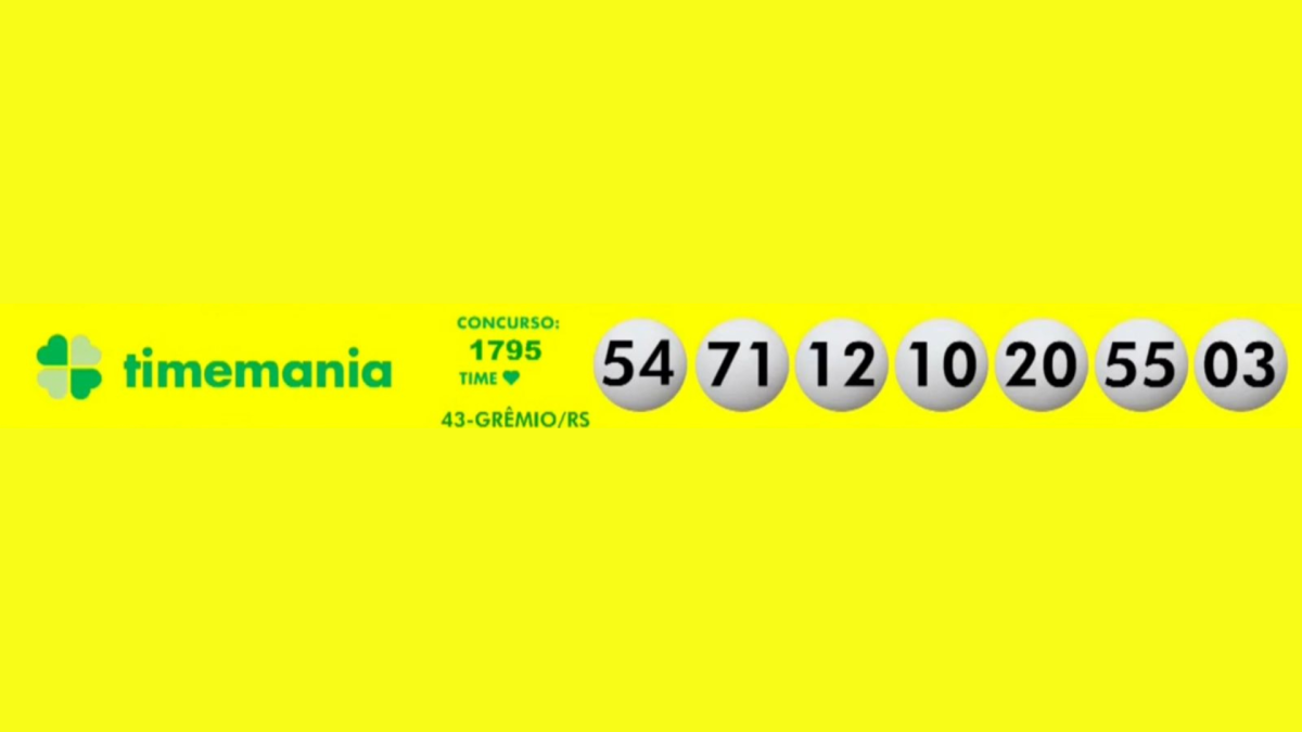 A Timemania, com prêmio previsto de R$ 33 milhões, apresentou o seguinte resultado: 03-10-12-20-54-55-71. O time do coração é o Grêmio, do Rio Grando do Sul.