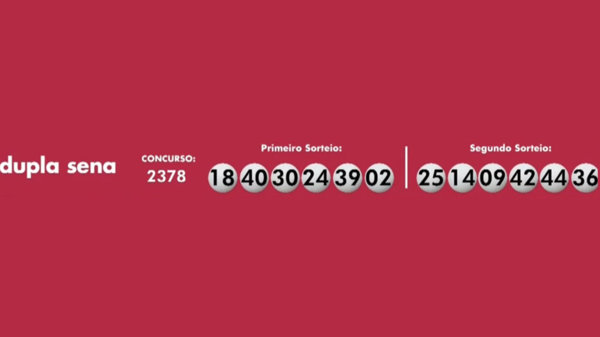 A Dupla Sena teve os seguintes números sorteados: 02-18-24-30-39-40 no primeiro sorteio; 09-14-25-36-42-44 no segundo sorteio. Os prêmios previsto são de R$ 5,9 milhões e de R$ 101 mil.