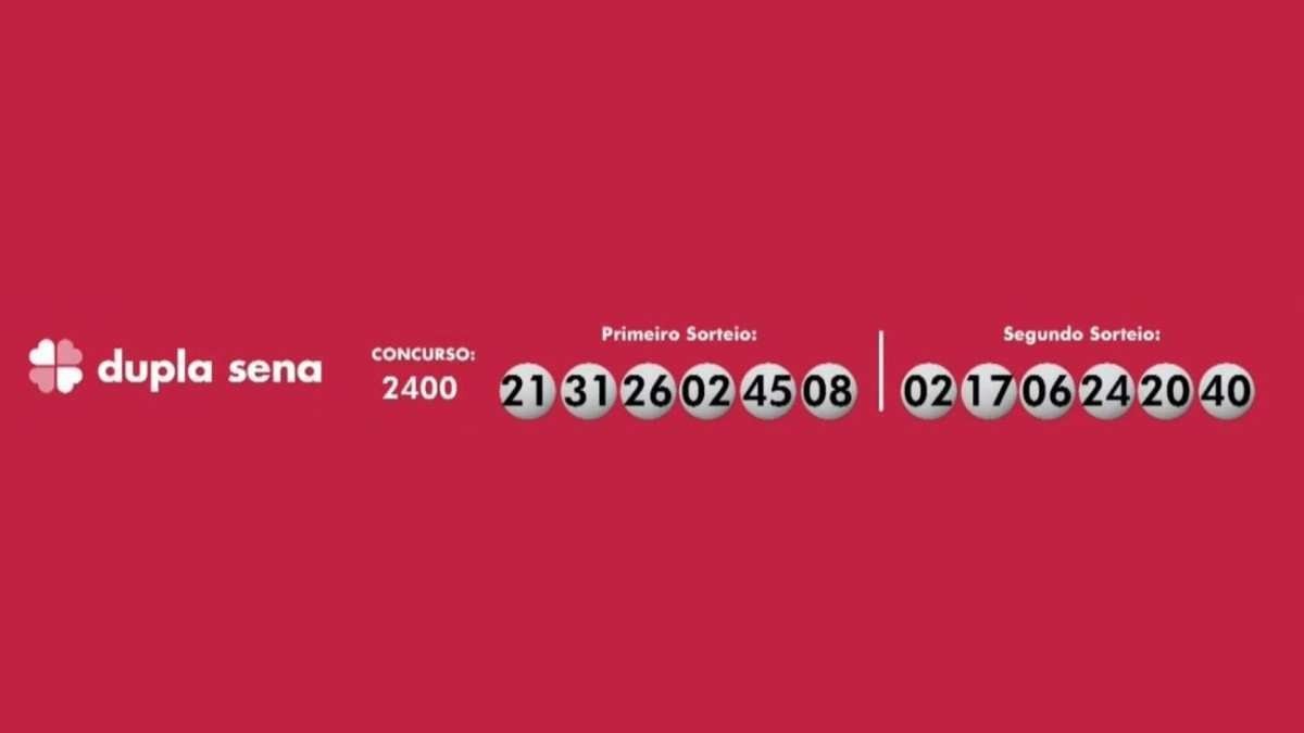 A Dupla Sena teve os seguintes números sorteados: 02-08-21-26-31-45 no primeiro sorteio; 02-06-17-20-24-40 no segundo sorteio. O prêmio previsto é de R$ 1,8 milhão.