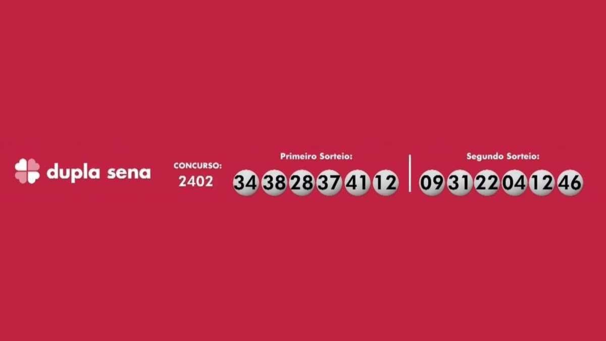 A Dupla Sena teve os seguintes números sorteados: 12-28-34-37-38-41 no primeiro sorteio; 04-09-12-22-31-46 no segundo sorteio. O prêmio previsto é de R$ 2,3 milhões.