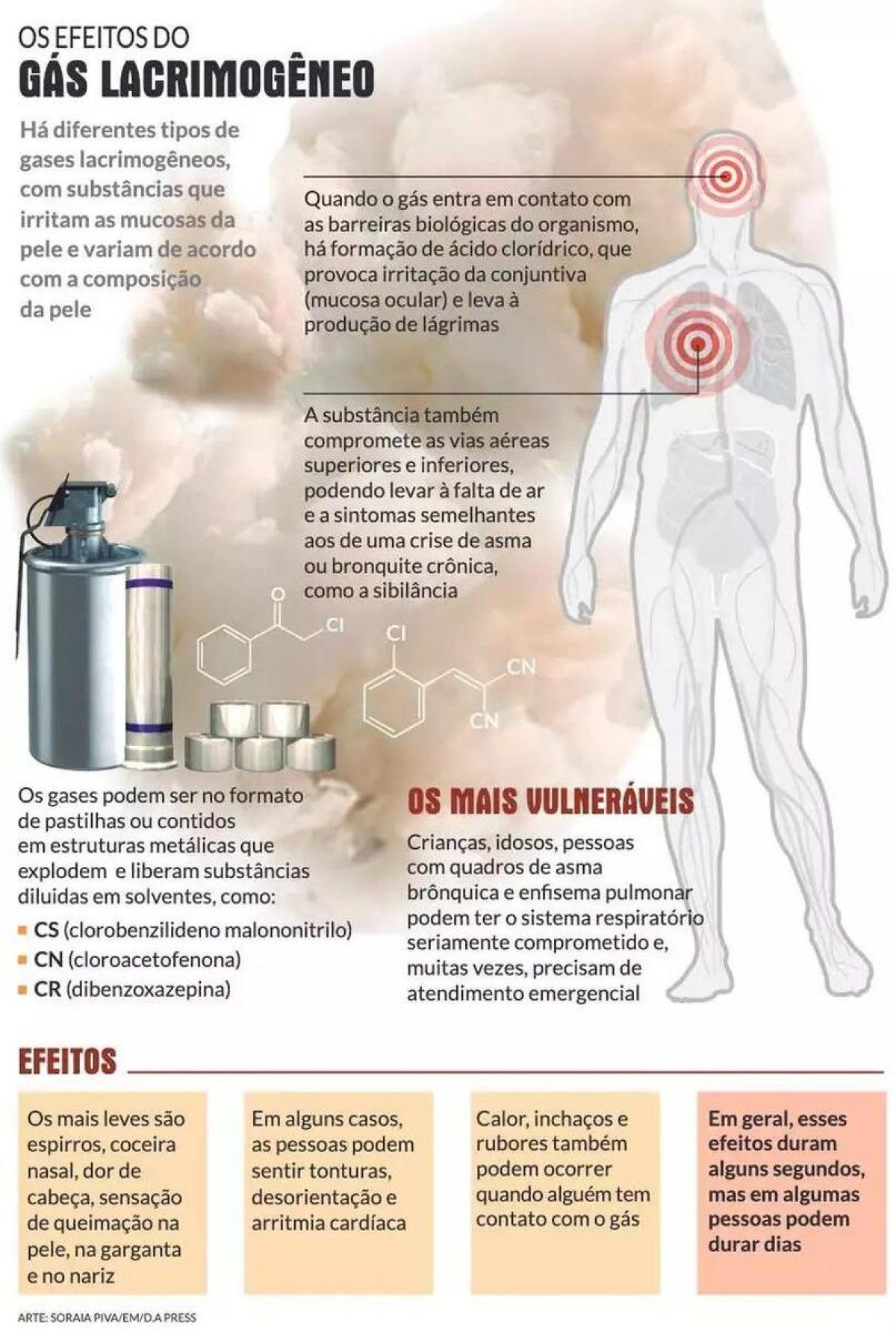 Segundo o Dr. Luiz Carlos Molinari, oftalmologista que atuou por 37 anos no Hospital João XXIII, os impactos do gás lacrimogêneo no organismo podem variar de acordo com a composição química específica de cada substância, além do tempo de contato, a concentração do gás e as condições prévias da pessoa atingida, como bronquite ou asma.