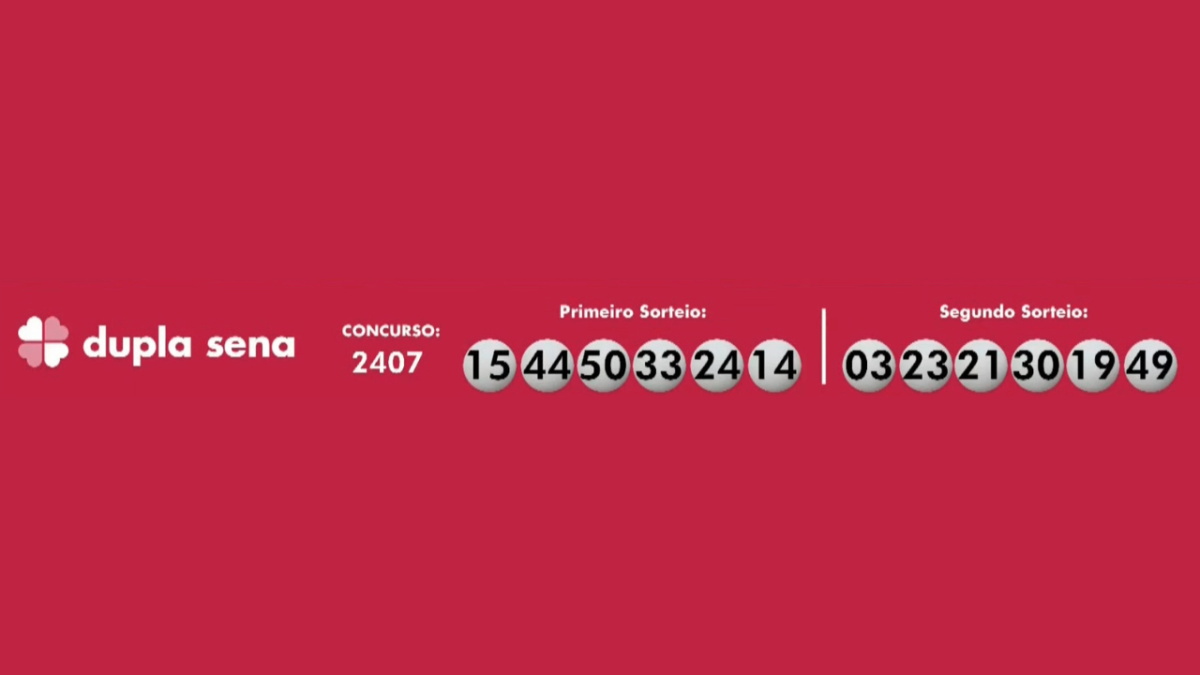 A Dupla Sena teve os seguintes números sorteados: 15-44-50-33-24-14 no primeiro sorteio; e 03-23-21-30-19-49 no segundo sorteio. O prêmio previsto era de R$ 3,6 milhões.
