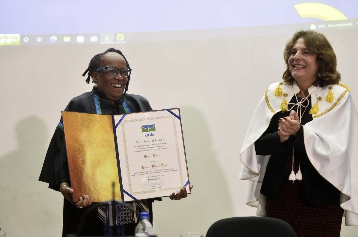 Aos 72 anos e figurando entre as principais autoras do feminismo brasileiro, a filósofa, escritora e ativista antirracismo Sueli Carneiro entra para a história da Universidade de Brasília (UnB) como a primeira mulher negra a receber o título de doutora Honoris Causa. A cerimônia ocorreu na tarde de ontem, no auditório da Faculdade de Direito, e contou com presença maciça de estudantes, amigos e representantes de movimentos sociais negros do DF. O título foi entregue pela reitora Márcia Abrahão, que destacou a trajetória de luta de Sueli e o pioneirismo que sempre pautou a história da instituição.