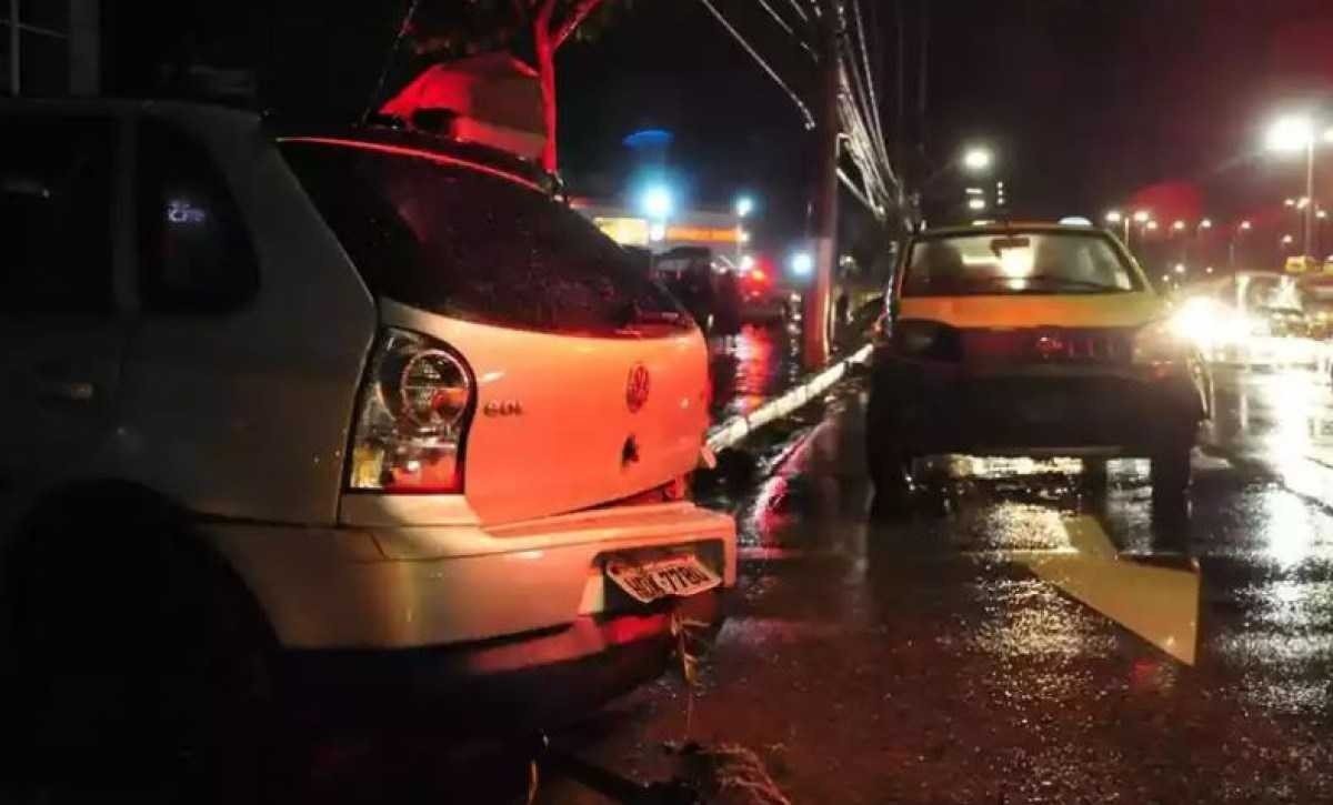 Entre os modelos estão um Fiat Argo cinza, um Chevrolet Onix Plus branco, um Chevrolet Spin preto, um Fiat Uno verde, um Ford Ka sedã prata e um Volkswagen Gol G3 prata.