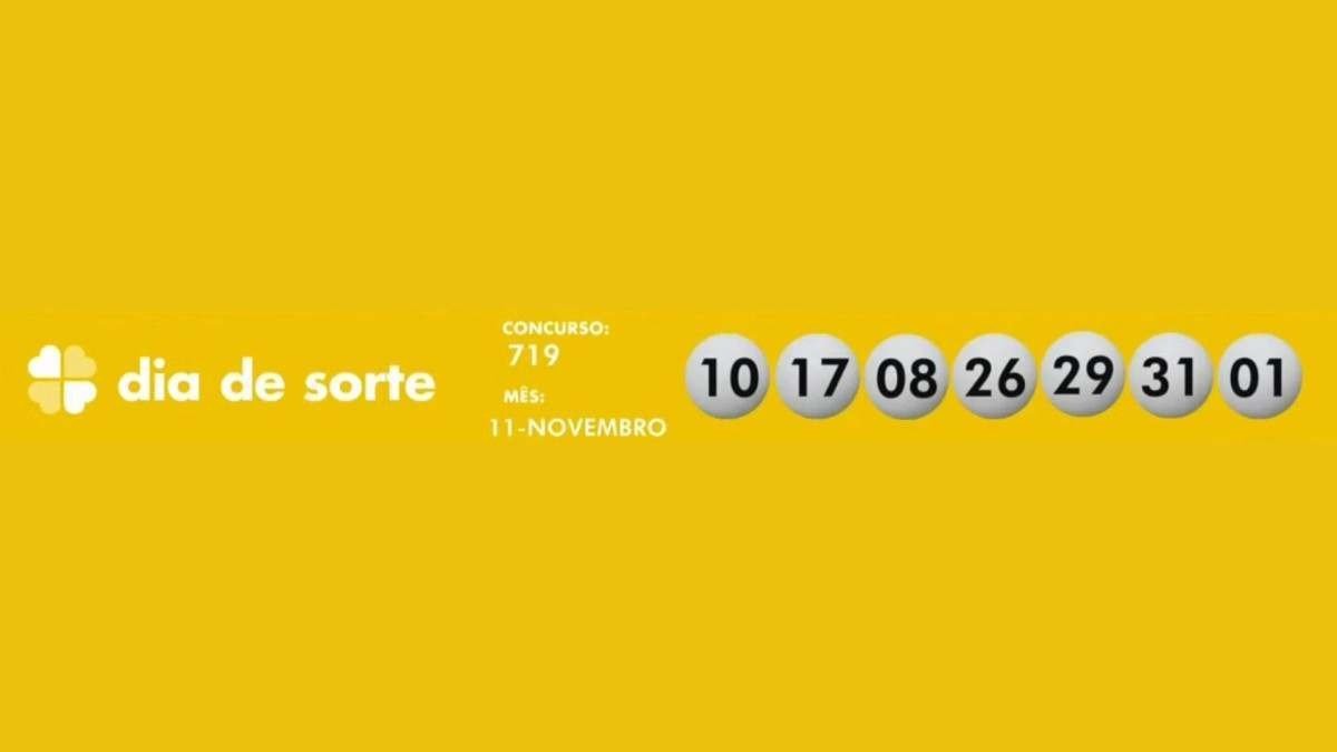 Com prêmio previsto de R$ 150 mil, o Dia de Sorte teve o seguinte resultado: 10-17-08-26-29-31-01. O mês da sorte é novembro.