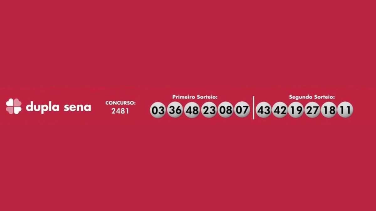 A Dupla Sena teve os seguintes números sorteados: 03-36-48-23-08-07 no primeiro sorteio; e 43-42-19-27-18-11 no segundo sorteio. O prêmio previsto era de R$ 1,6 milhão.