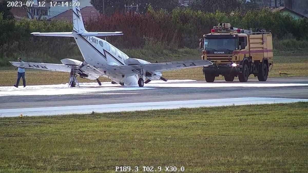 Avião bimotor tem problemas na aterrissagem e toca bico na pista em Sorocaba
