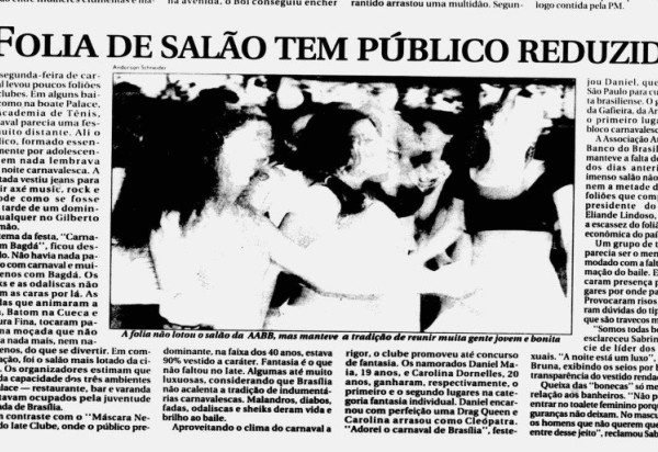 Paralelamente, em contextos festivos e de entretenimento, a presença de travestis e drag queens aparecia de forma mais integrada à vida social. Concursos como “Miss Brasília” registravam a participação dessas figuras nas colunas sociais, misturando reconhecimento estético e tom de fofoca. No final dos anos 1990, o Carnaval voltaria a ser palco dessa visibilidade ambígua: celebração, espetáculo e exclusão coexistindo no mesmo espaço.