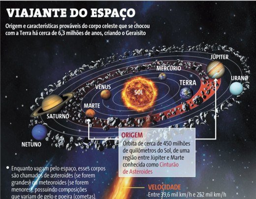A formação do Geraisito é apenas a parte mais rápida da história, já que o corpo celeste que colidiu contra a Terra há mais de 6 milhões de anos pode ter vindo de muito longe (veja arte na página ao lado). Pode se tratar de um cometa, mas a professora Maria Elizabeth Zucolotto, da UFRJ, astrônoma responsável pelo Setor de Meteorítica do Museu Nacional do Rio de Janeiro, diz que geralmente os impactos no planeta vêm de asteroides que têm uma órbita a cerca de 450 milhões de quilômetros do Sol, originários de uma região entre Júpiter e Marte conhecida como Cinturão de Asteroides.