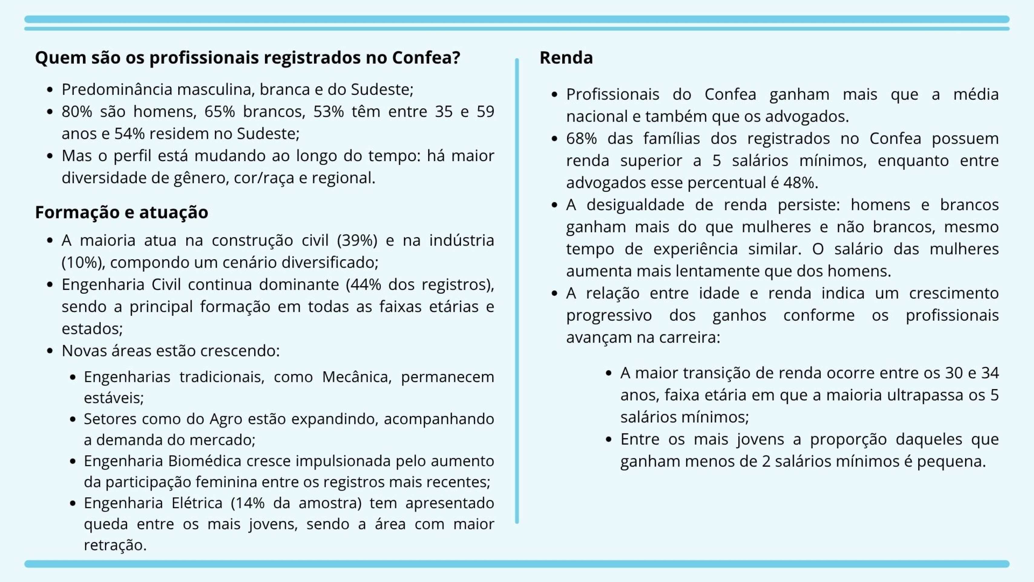 Profissionais das áreas de Engenharia, Agronomia e Geociências apresentam renda acima da população em geral. Estima-se que 68% dos trabalhadores desses segmentos possuem renda mensal superior a cinco salários mínimos. Além desse recorte positivo, quase a totalidade está empregada, chegando a 92% de pessoas. Os dados, apresentados pelo Conselho Federal de Engenharia e Agronomia (Confea), fazem parte da pesquisa quantitativa realizada pela entidade.