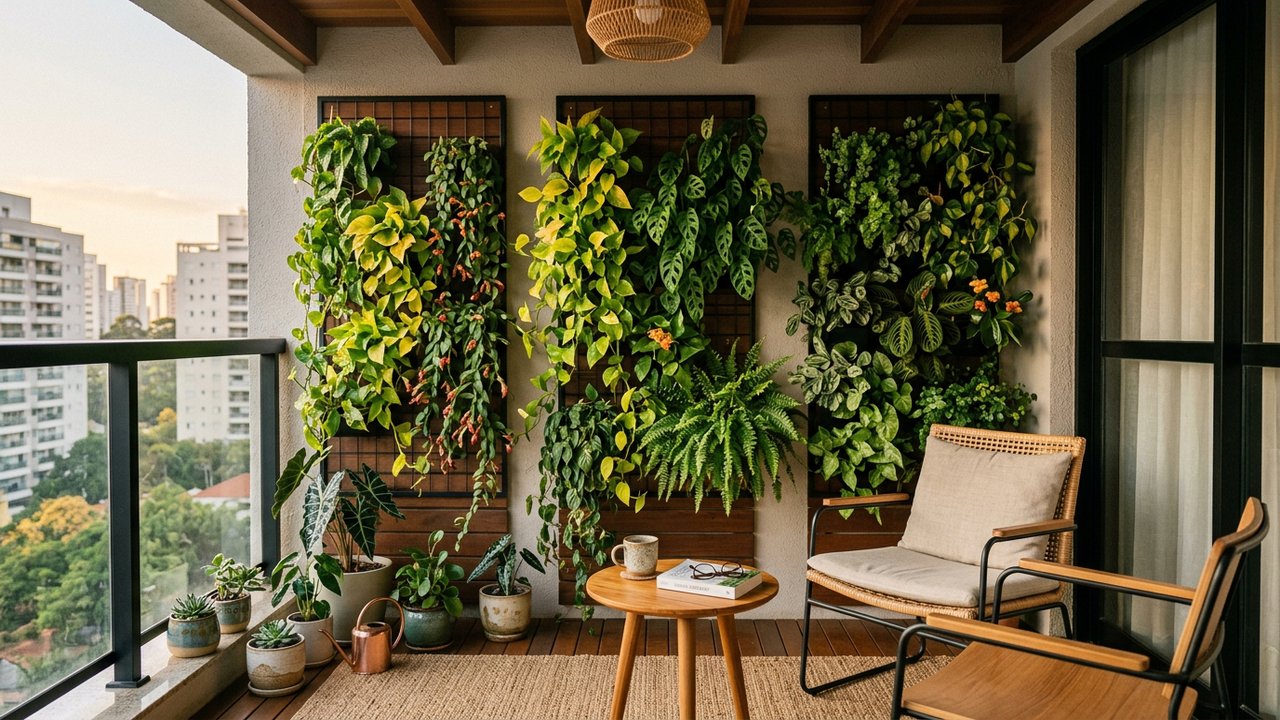 A implementação de um jardim vertical é a solução definitiva para quem possui pouco espaço, mas não abre mão de uma densa camada de verde. Ao utilizar as paredes, você libera a circulação da varanda e cria um isolamento térmico e acústico natural que melhora o conforto do ambiente interno da residência.