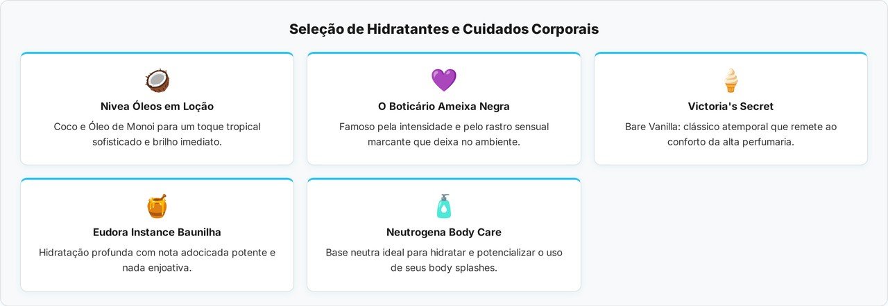 Marcas consagradas como Nivea oferecem linhas que combinam óleos essenciais com fragrâncias delicadas, proporcionando aquele aspecto de pele bem cuidada que remete ao luxo. É essencial focar em produtos que contenham manteiga de karité ou óleo de amêndoas, pois esses ingredientes retêm a umidade e servem como base fixadora para as notas de topo e fundo.