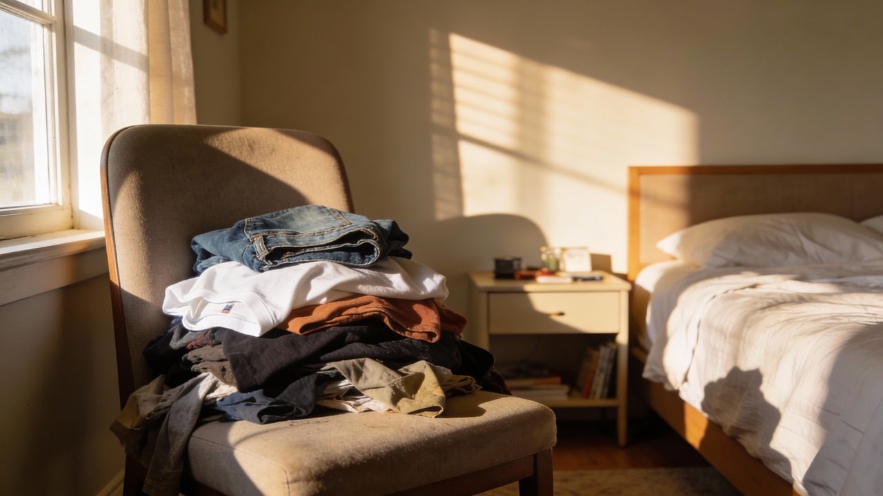 Nós buscamos o caminho de menor resistência após um dia cansativo, transformando a cadeira em um depósito temporário que vira permanente. Esse hábito cria um ciclo vicioso onde a bagunça se torna parte da paisagem do quarto.