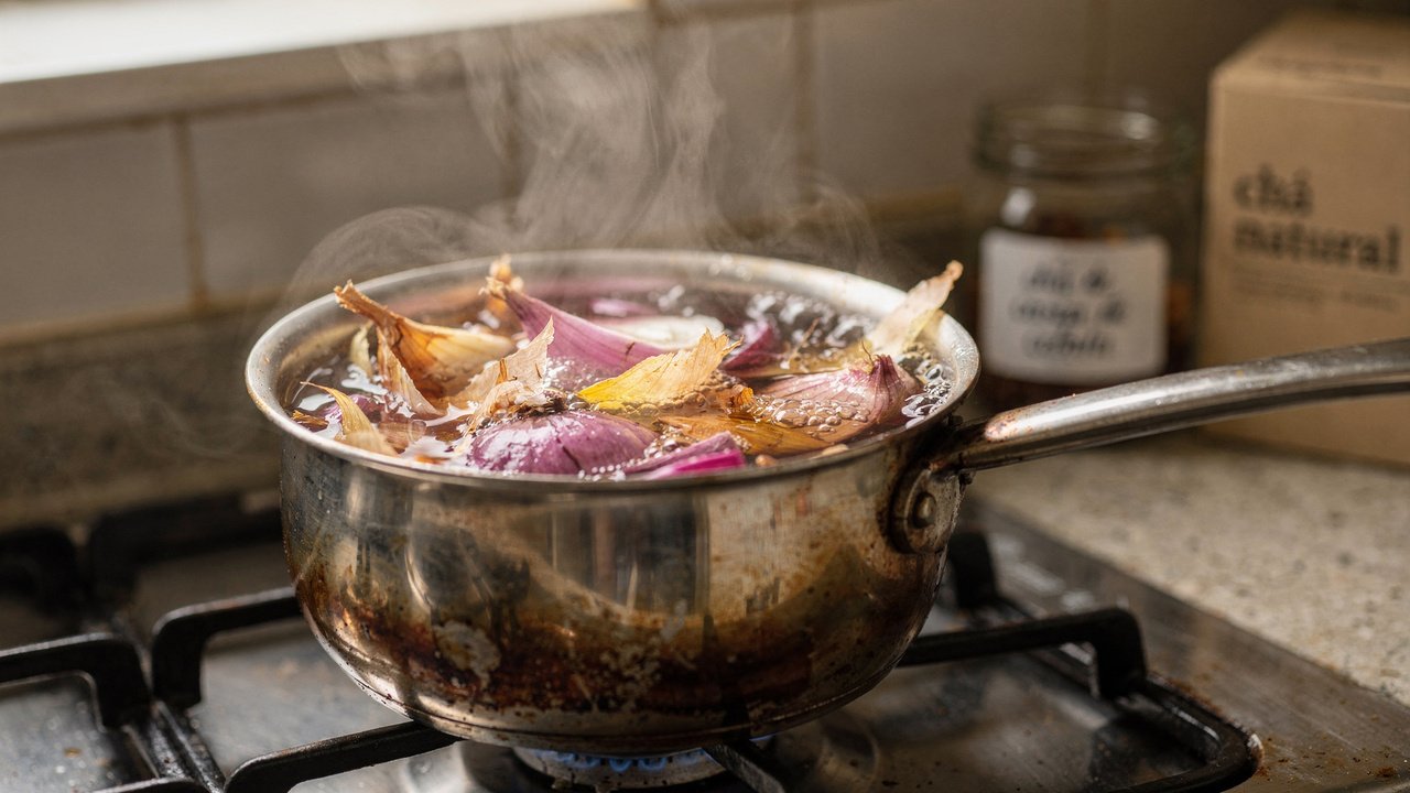 Lave muito bem as cascas de duas cebolas grandes e ferva junto com 500 ml de água por cerca de 10 minutos. Depois de ferver, desligue o fogo, tampe a panela e deixe descansando por mais 5 minutos antes de coar.