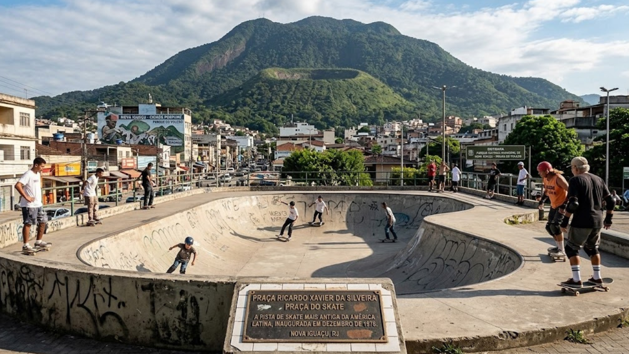 E tem mais: inaugurada em 4 de dezembro de 1976, a pista de skate da Praça Ricardo Xavier da Silveira é apontada como a primeira da América Latina, reconhecida pela própria Prefeitura de Nova Iguaçu. Com 980 metros quadrados de rampa em formato de piscina, a estrutura atraía skatistas da zona sul carioca quando só existia uma pista do tipo na Califórnia.