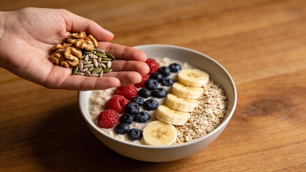 - Incluir nozes e sementes diariamente: consumir uma pequena porção de castanhas ou amêndoas entre as refeições; adicionar sementes de chia ou linhaça a saladas, sopas e cereais.
