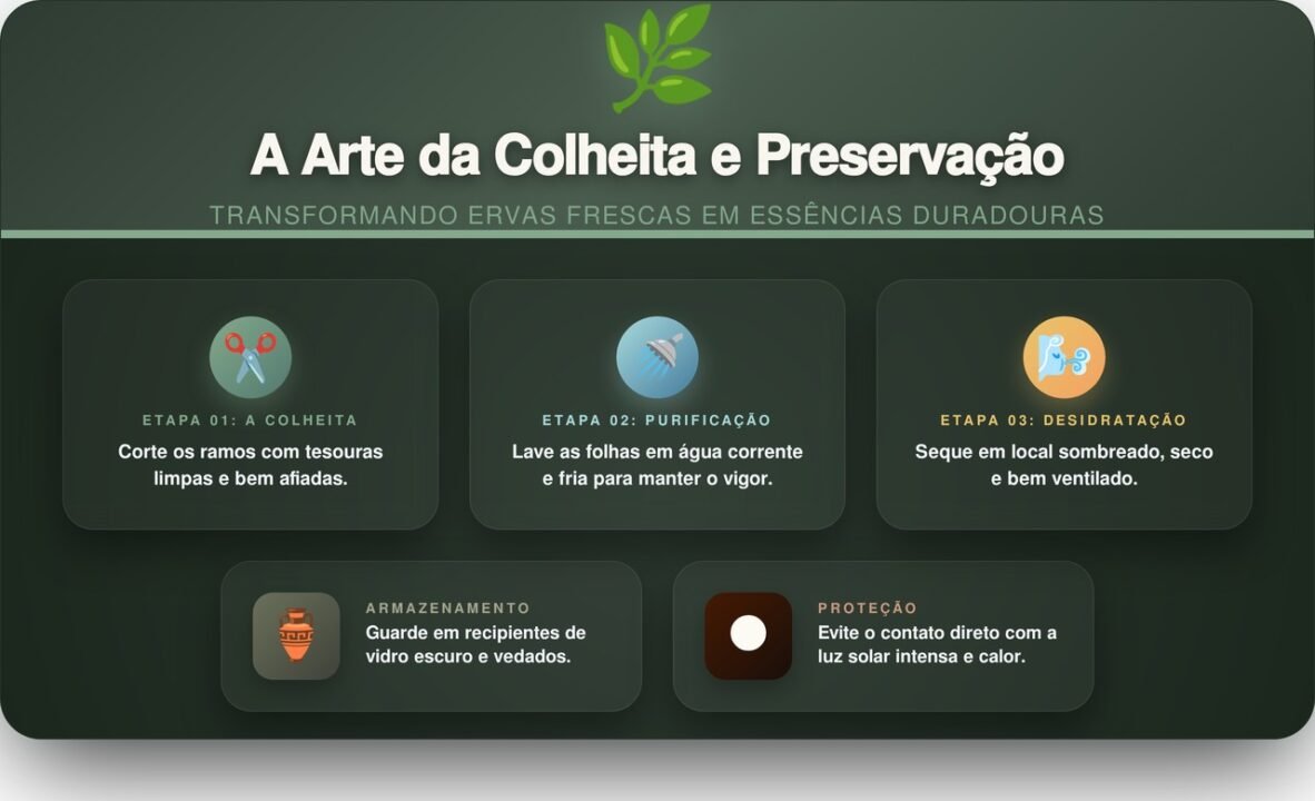 A colheita deve ser feita preferencialmente durante as primeiras horas da manhã para preservar a concentração máxima dos princípios ativos voláteis. É fundamental cortar apenas as partes superiores dos ramos, permitindo que a planta continue brotando com vigor e saúde durante todo o ano. A adoção de métodos simples garante a integridade botânica permanente: