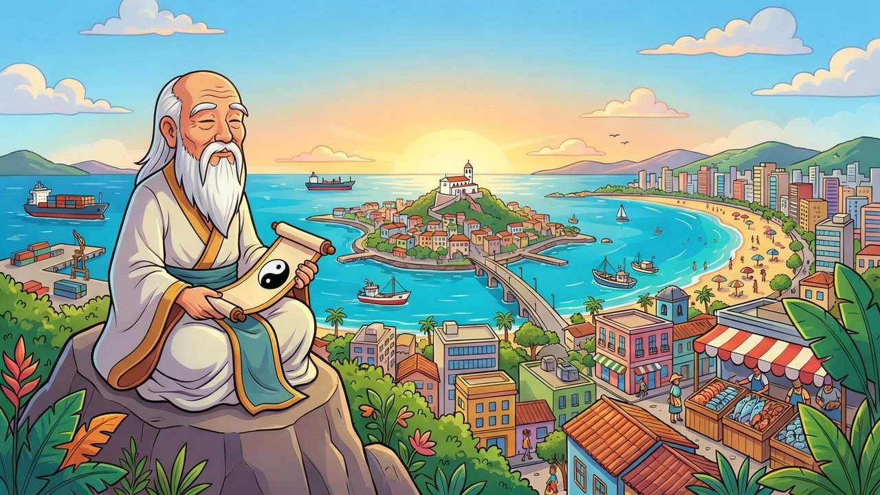 Imagina o Lao-Tsé vivendo em Vitória, Espírito Santo, sentindo o ventinho da orla, olhando o mar calmo e soltando aquelas sabedorias que parecem onda mansa chegando devagarinho na areia, sempre num ritmo tranquilo igual o jeito capixaba de levar a vida.