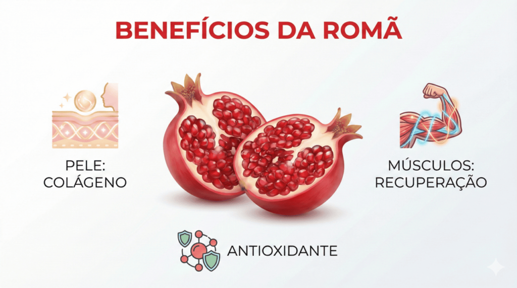 Diferente de outras frutas vermelhas, a romã não apenas combate radicais livres; ela atua na arquitetura do corpo, ajudando a reconstruir a pele e a recuperar músculos fadigados.