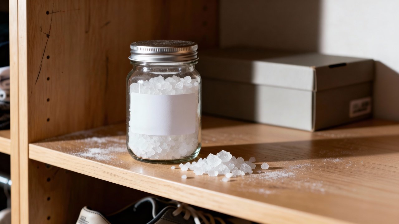 A solução mais potente e barata para locais fechados (como armários, despensas e quartos sem janela) é o uso do Cloreto de Cálcio. Sabe aqueles potinhos “anti-mofo” que vendem no supermercado e custam caro? O ingrediente ativo deles é exatamente esse pó branco.