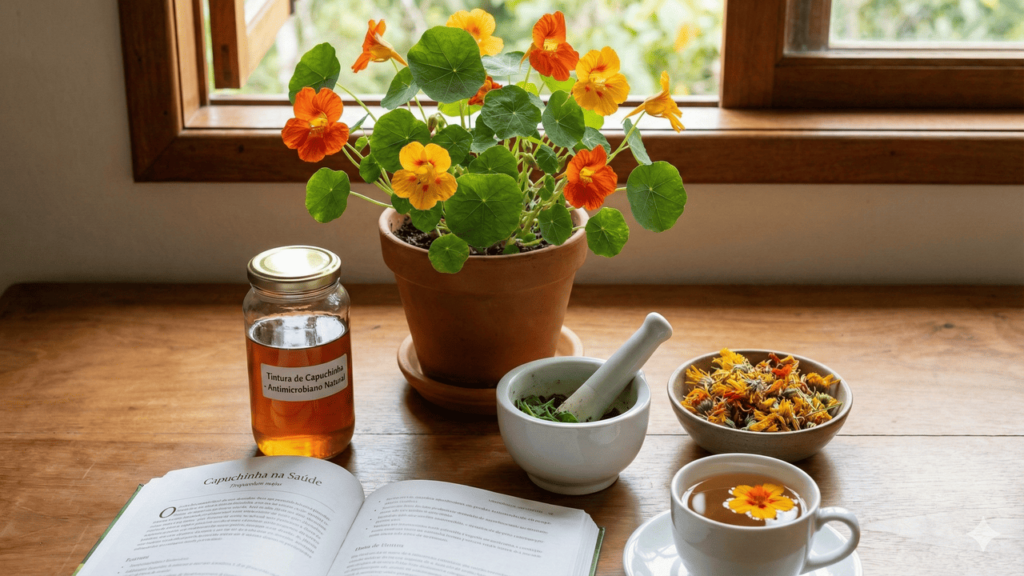 Outro ponto relevante é que a capuchinha costuma ser combinada com alimentos frescos, como folhas verdes, tomate, pepino e grãos integrais. Em algumas regiões do Brasil, é consumido também um chá preparado com partes da planta, associado, na sabedoria popular, a uma digestão mais confortável, embora faltem estudos clínicos robustos que confirmem esses efeitos.
