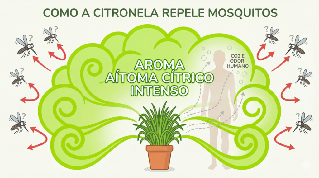 Os mosquitos são atraídos pelo dióxido de carbono que exalamos e pelo ácido láctico presente no nosso suor. O óleo essencial presente nas folhas da Citronela liberta um aroma muito forte que confunde os sensores olfativos dos insetos. Essencialmente, a planta “esconde” o cheiro humano, tornando o ambiente hostil e confuso para o mosquito, que prefere afastar-se para procurar alvos mais fáceis.