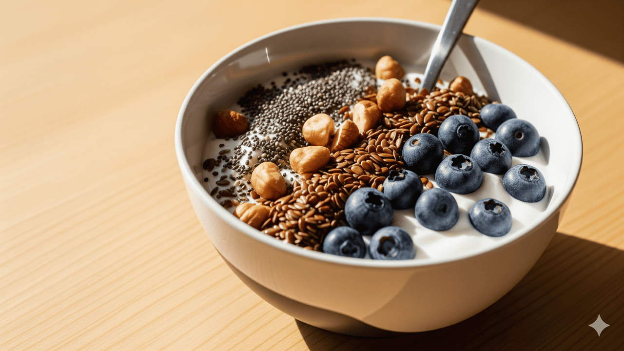 Uma forma prática de aproveitar o ômega-3 no dia a dia é preparar um creme funcional de iogurte com chia, linhaça e nozes. Essa combinação reúne gorduras boas, fibras que liberam energia aos poucos e proteínas que aumentam a saciedade, ajudando a manter o foco por mais tempo.
