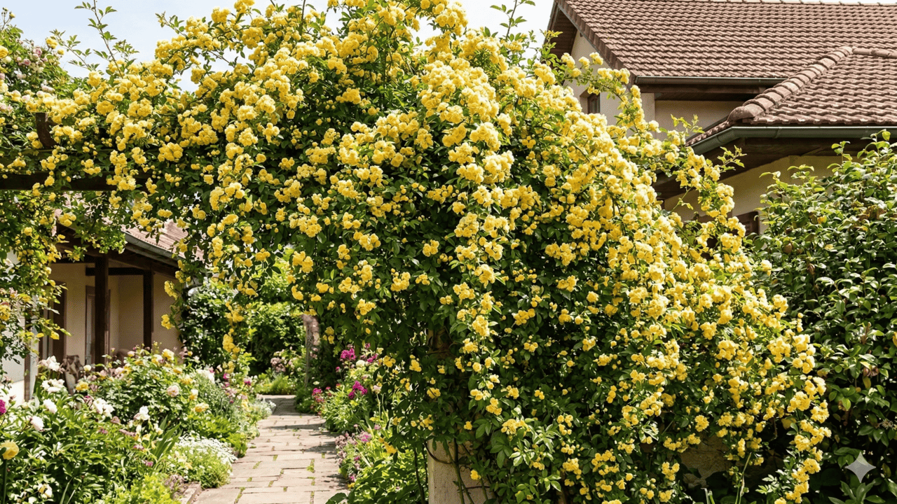Entre tantas trepadeiras possíveis, a roseira Banksia se destaca por unir beleza, vigor e praticidade. Ele cobre grandes áreas em pouco tempo, exige manutenção simples e quase não tem espinhos, o que torna a convivência muito mais tranquila em áreas de circulação.