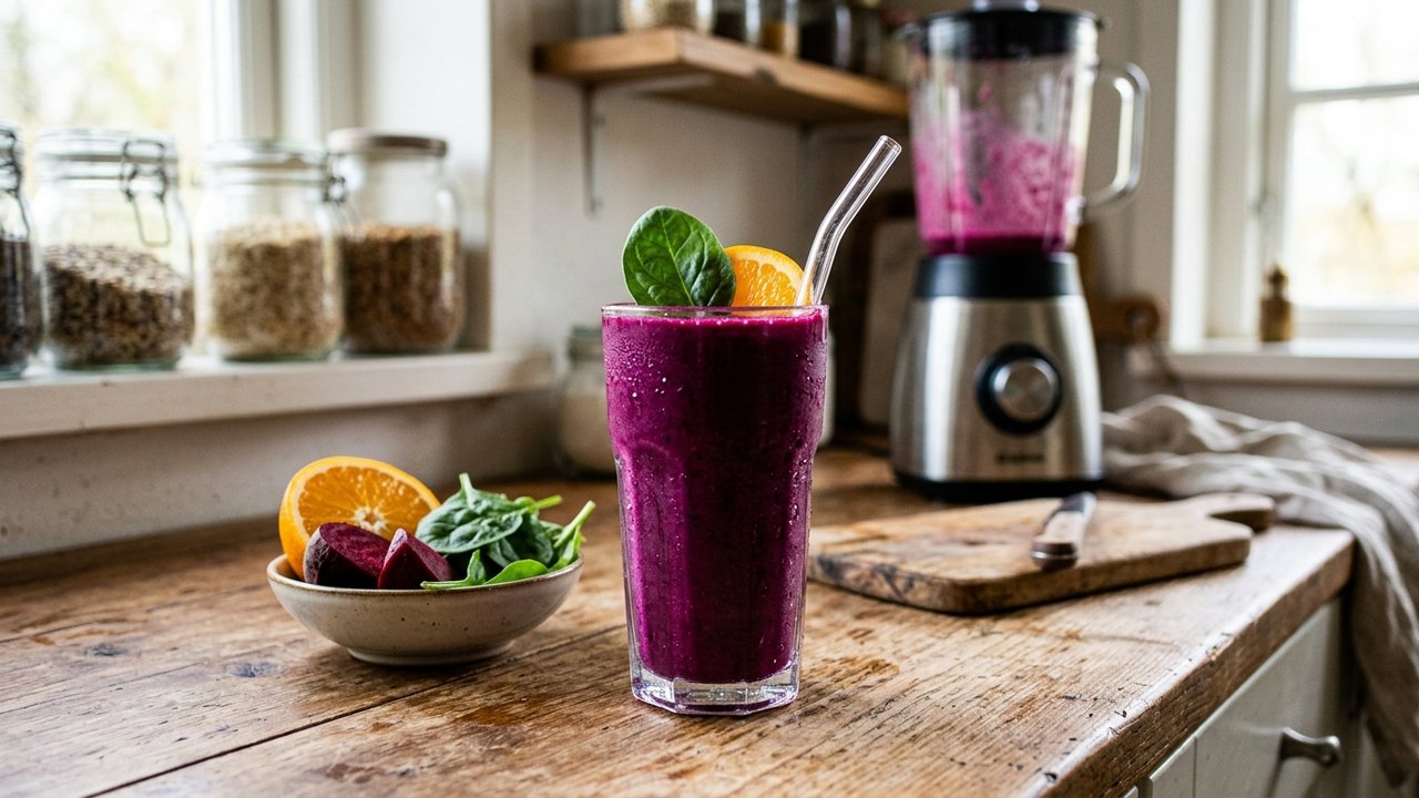 O preparo da vitamina roxa exige itens naturais fáceis de encontrar em qualquer feira livre ou mercado local. A base central da receita utiliza meia beterraba crua, que confere a coloração intensa característica, e um punhado generoso de folhas de espinafre fresco.