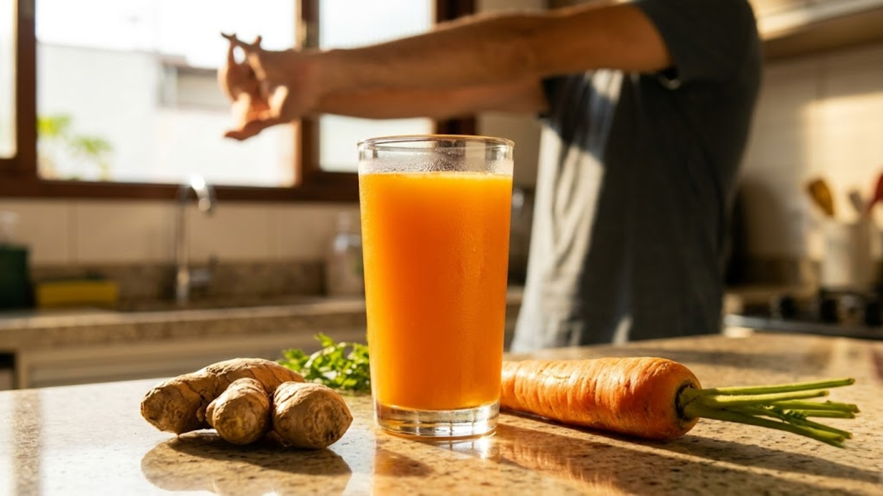A primeira batida exige apenas 1 rodela fina de gengibre, 1 cenoura pequena, suco de 2 laranjas e 1 colher de mel para quebrar o azedo. Essa mistura junta o poder do betacaroteno com a força da Vitamina C pura e crua.