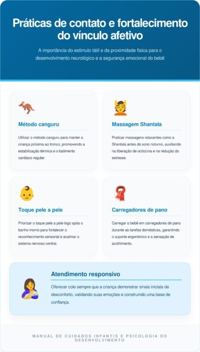 O atendimento imediato às necessidades de proximidade física ensina ao bebê que o mundo é um lugar seguro. Quando um recém-nascido percebe que seu choro é ouvido e respondido com acolhimento, ele desenvolve um apego seguro com os pais. Esse fundamento psicológico é determinante para que a criança cresça com maior autoestima e autonomia emocional nas fases posteriores.