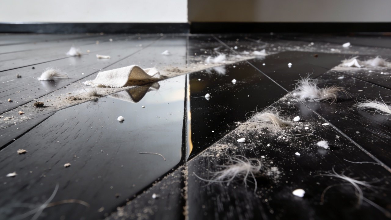 Ao cair sobre uma superfície preta ou marrom café, cria-se um alto contraste imediato. Você varre a sala às 8h da manhã e, às 10h, já consegue ver uma camada fina de partículas brancas cobrindo o chão novamente, gerando uma frustração constante.