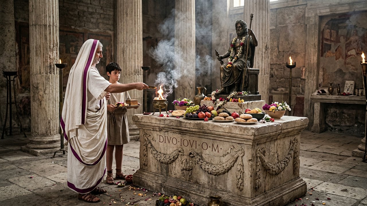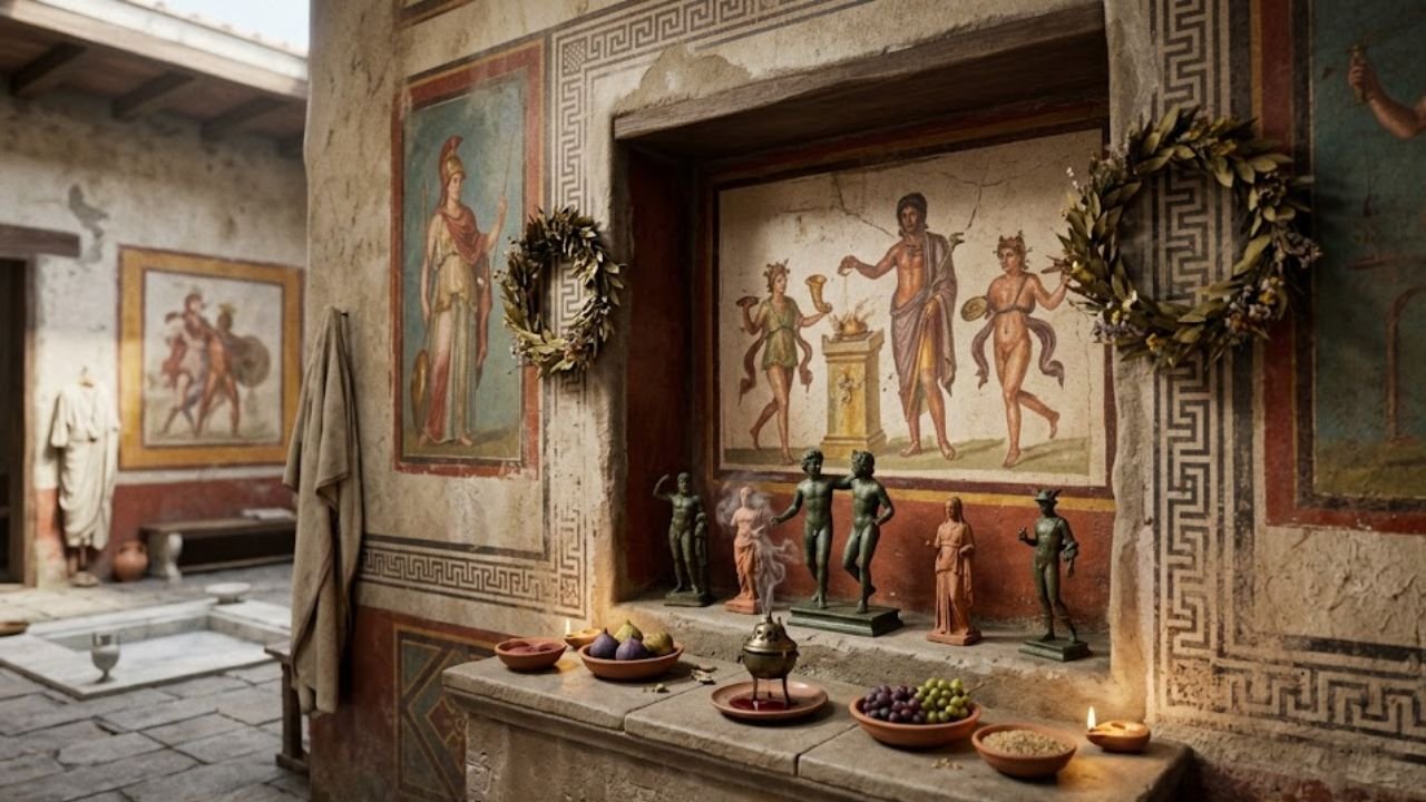 Embora os grandes templos fossem o palco da religião oficial, o Lararium — o altar doméstico — era onde a conexão mais íntima com os deuses acontecia diariamente. Cada família romana possuía divindades protetoras específicas, conhecidas como Lares e Penates, que recebiam pequenas porções de comida durante o jantar para garantir a prosperidade do lar.