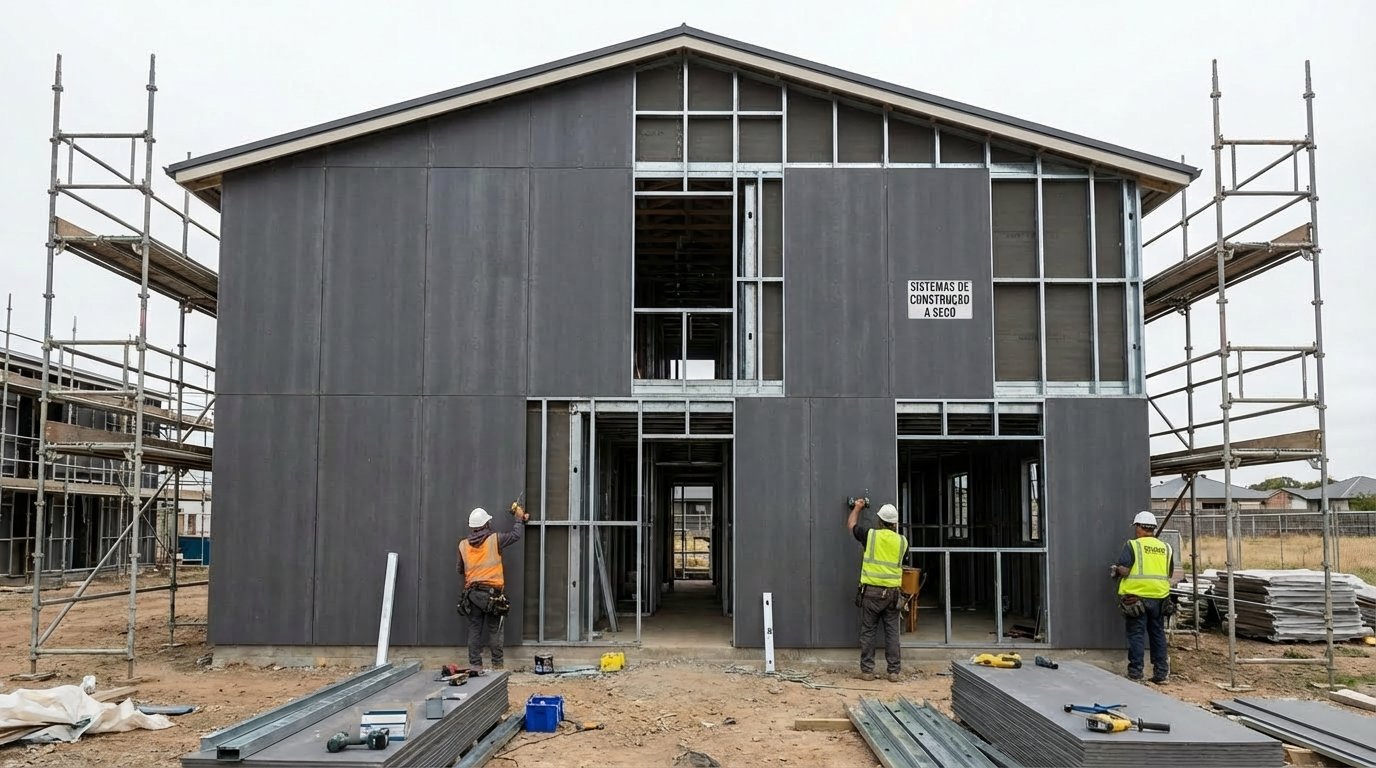 A placa cimentícia impermeabilizada protege a estrutura externa imediatamente e dispensa o uso cansativo do reboco molhado. Essa tecnologia inteligente barra a umidade violenta das tempestades e acelera a entrega da obra residencial com um processo limpo.