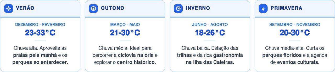O clima tropical garante calor o ano inteiro, com chuvas concentradas entre outubro e janeiro. O inverno seco é a época mais confortável para caminhadas e trilhas.