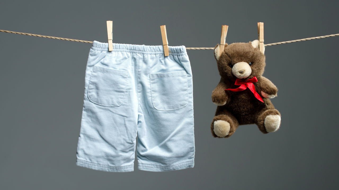 Roupas infantis no varal e ursinho // Créditos: depositphotos.com / Geribody