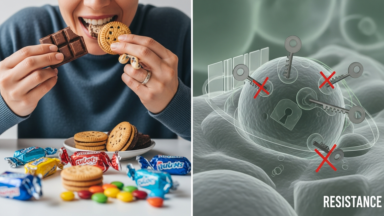 Quando você consome muito açúcar, o pâncreas libera insulina em excesso para tentar normalizar a glicose no sangue. Com a exposição crônica, as células tornam-se resistentes a esse hormônio, o que é o principal gatilho para o desenvolvimento do diabetes tipo 2 e da síndrome metabólica.