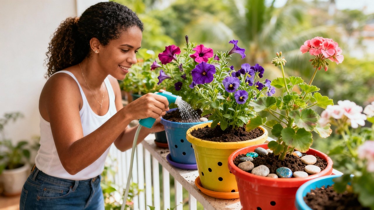 Flores, como petúnias, violetas e gerânios, assim como hortaliças de pequeno porte, como alface, rúcula e tomate-cereja, também são ótimas escolhas. Espécies de crescimento anão ou compactas tendem a ter melhor desempenho em vasos, facilitando o cuidado diário.