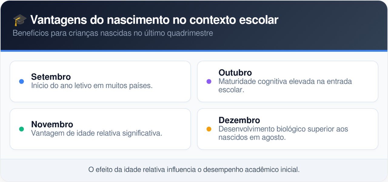 Em diversos sistemas de ensino ao redor do globo, o calendário letivo favorece quem nasce em meses específicos que coincidem com o início do ciclo escolar. Esses alunos entram na escola com uma vantagem de desenvolvimento que se traduz em notas mais altas e maior fluidez verbal. É fundamental observar como esse padrão se repete em diferentes culturas e metodologias pedagógicas.