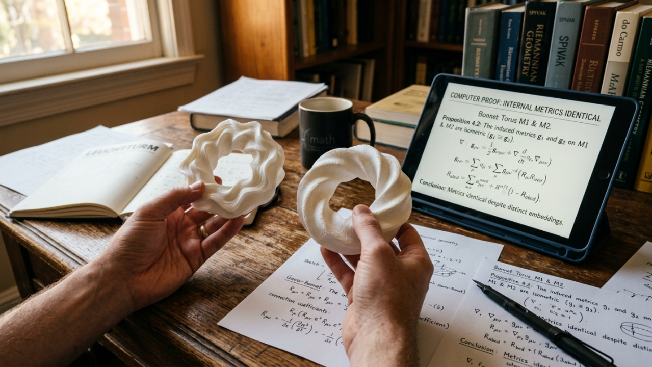 Um resultado matemático recente reacendeu um debate clássico da geometria: até que ponto conhecer todas as medidas internas de uma superfície é suficiente para determinar sua forma no espaço? Um novo estudo exibe dois “donuts” geométricos que, embora diferentes visualmente, compartilham exatamente as mesmas distâncias internas e a mesma curvatura média em cada ponto, dando um novo fôlego ao chamado problema global de Bonnet, discutido desde o século XIX na geometria diferencial.