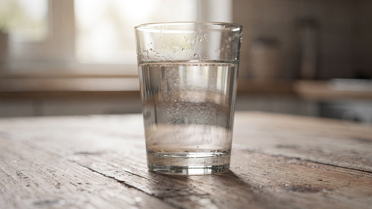 Copo de água cristalina em mesa de madeira sob luz matinal.