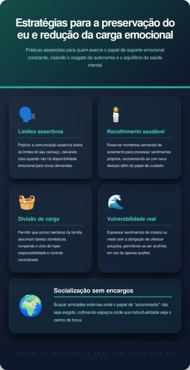O peso de carregar as expectativas alheias consome uma energia vital que deveria ser voltada ao autocuidado básico. Quem assume esse papel negligencia suas próprias necessidades para garantir que os outros membros da família estejam sempre bem e protegidos. Com o tempo, essa dinâmica gera um sentimento de solidão profunda, pois a força demonstrada afasta gestos de cuidado.