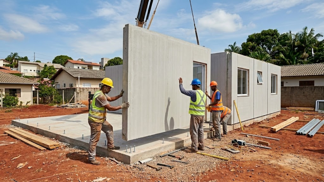 O processo foge totalmente daquela bagunça clássica de canteiro de obras cheio de areia e cimento espalhados. As fábricas produzem as paredes inteiras e o telhado em um ambiente fechado, seguindo medidas exatas de engenharia de produção.