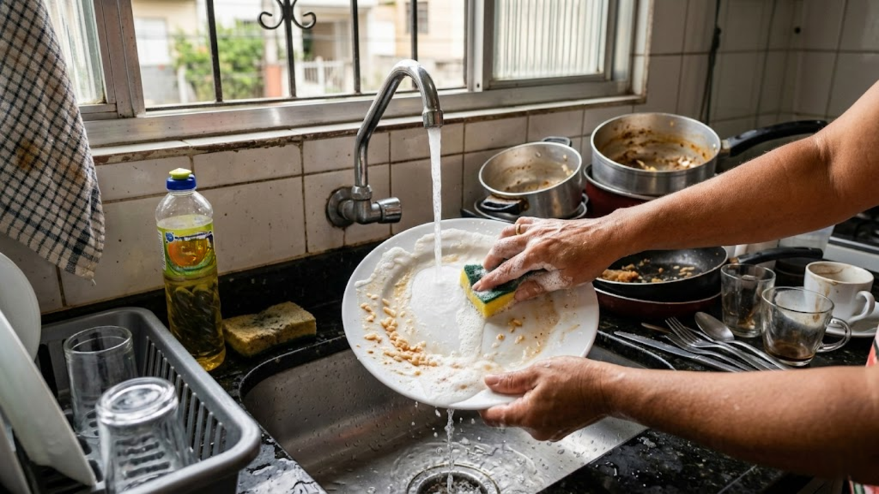 Quando você ensaboa todos os pratos juntos e enxágua todos de uma vez, a economia de recursos hídricos é gigantesca. Essa mudança simples de hábito garante uma pia limpa na hora e ainda ajuda a reduzir a conta de água da sua casa.