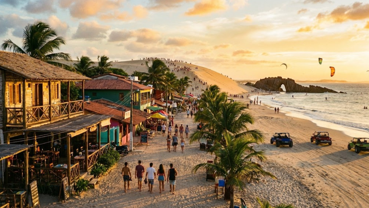 A vila de Jijoca de Jericoacoara no Ceará fica a cerca de 300 km de Fortaleza e preserva ruas de areia onde o asfalto não entra. O destino combina a simplicidade de uma antiga vila de pescadores com uma estrutura turística internacional, cercada por dunas móveis e lagoas de águas mornas.